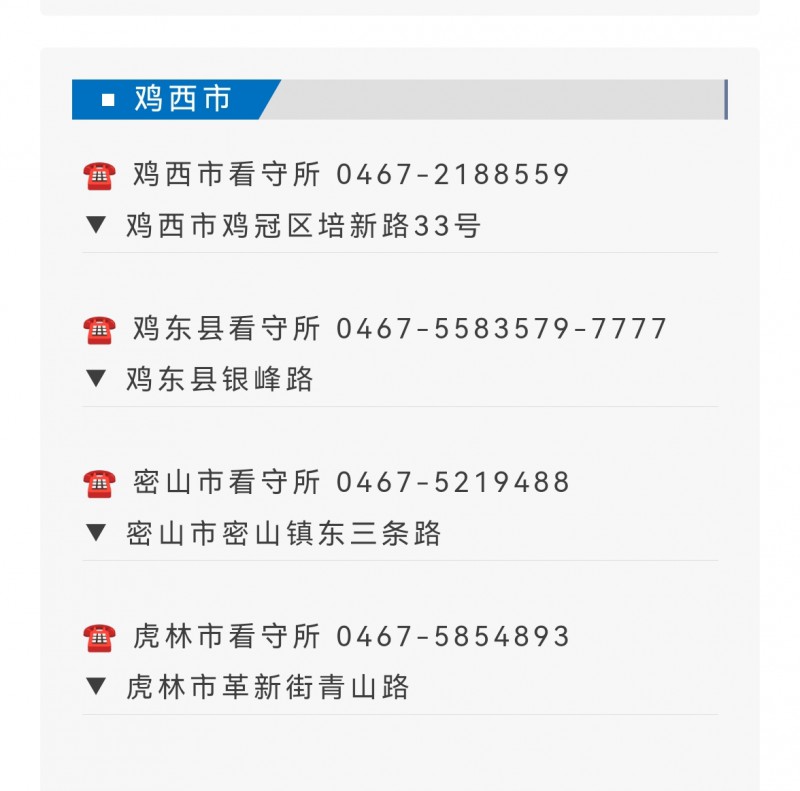 鸡西市辖区各个看守所机构地址和办公电话汇总表:鸡西市看守所地址电话,鸡东县看守所地址,密山市看守所电话,虎林市看守所地址。