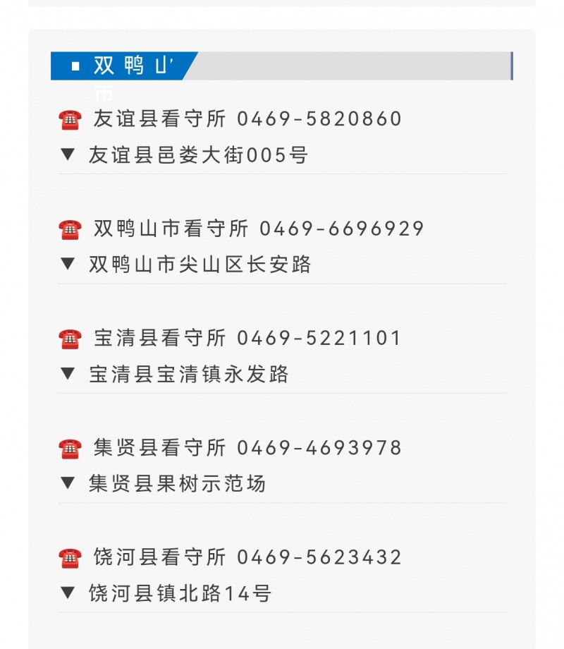 双鸭山市辖区各个看守所单位地址及办公电话汇总表:友谊县看守所地址,双鸭山市看守所地址电话,宝清县看守所地址,集贤县看守所电话,饶河县看守所地址。