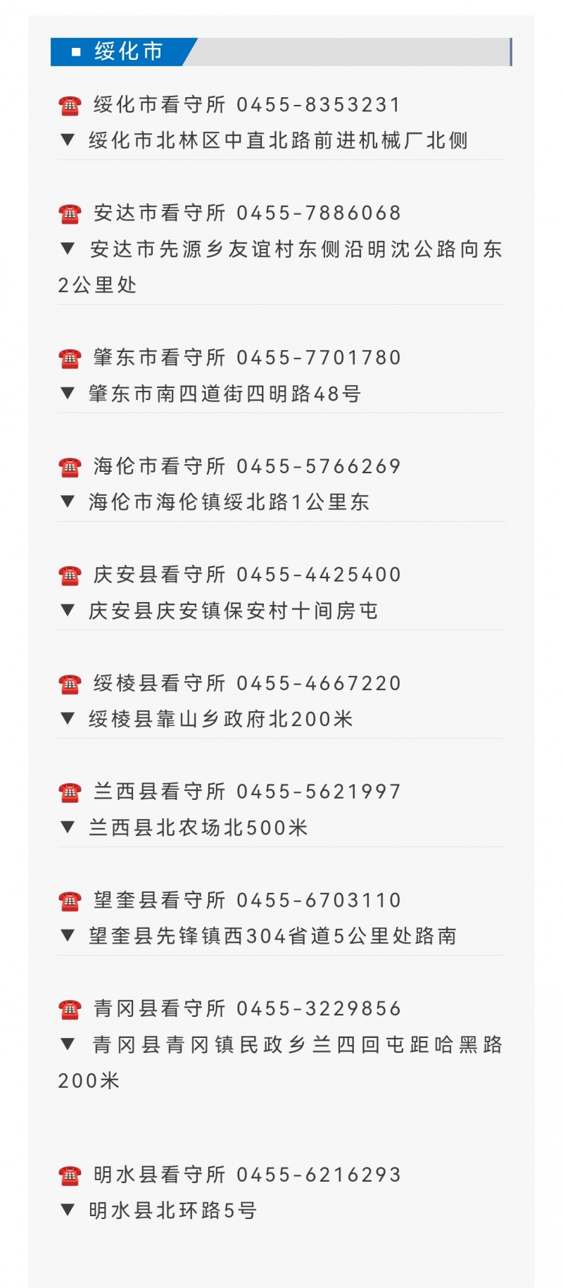 绥化市辖区各个看守所单位办公电话及地址信息汇总表:绥化市看守所地址,安达市看守所电话,肇东市看守所地址,海伦市看守所电话,庆安县看守所地址,绥棱县看守所电话,兰西县看守所地址,望奎县看守所电话,青冈县看守所地址,明水县看守所电话。