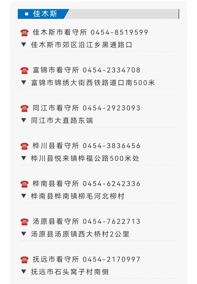 佳木斯市辖区各个看守所单位办公电话和地址信息汇总表:佳木斯市看守所地址电话,富锦市看守所电话,同江市看守所地址,桦川县看守电话,桦南县看守所地址,汤原县看守所电话,抚远市看守所地址。