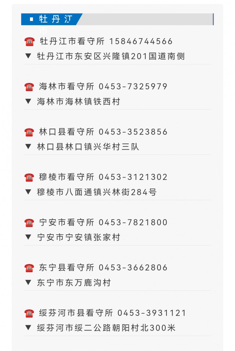 牡丹江市辖区各个看守所办公电话和单位地址信息汇总表:牡丹江市看守所地址电话,海林市看守所地址,林口县看守所电话,穆棱市看守所电话,宁安市看守所地址,东宁县看守所电话,绥芬河市看守所地址。
