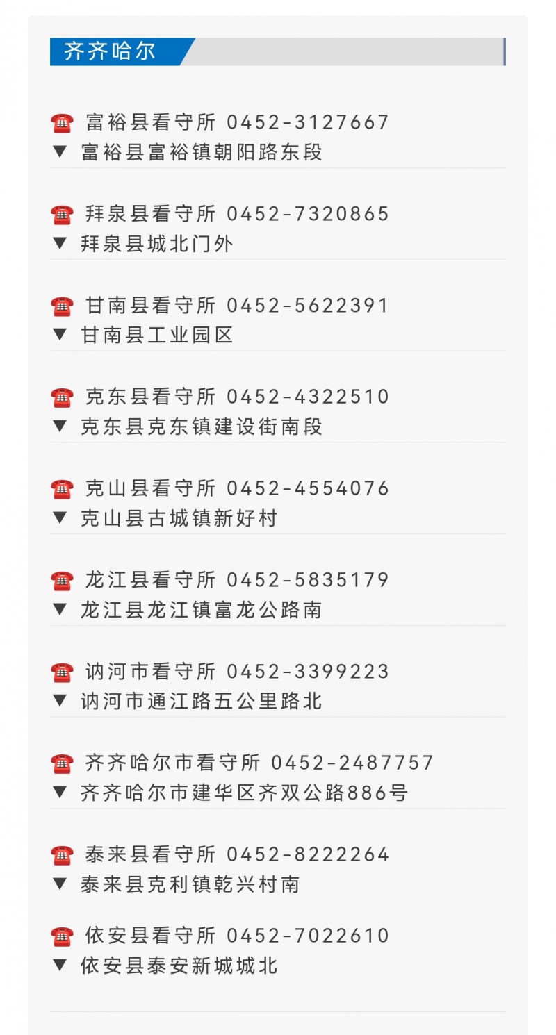 齐齐哈尔市辖区各个看守所机构地址和联系电话汇总表:富裕县看守所地址,拜泉县看守所电话,甘南县看守所地址,克东县看守所电话,克山县看守所地址,龙江县看守所电话,讷河市看守所地址,泰来县看守所电话,依安县看守所地址,齐齐哈尔市看守所地址电话。