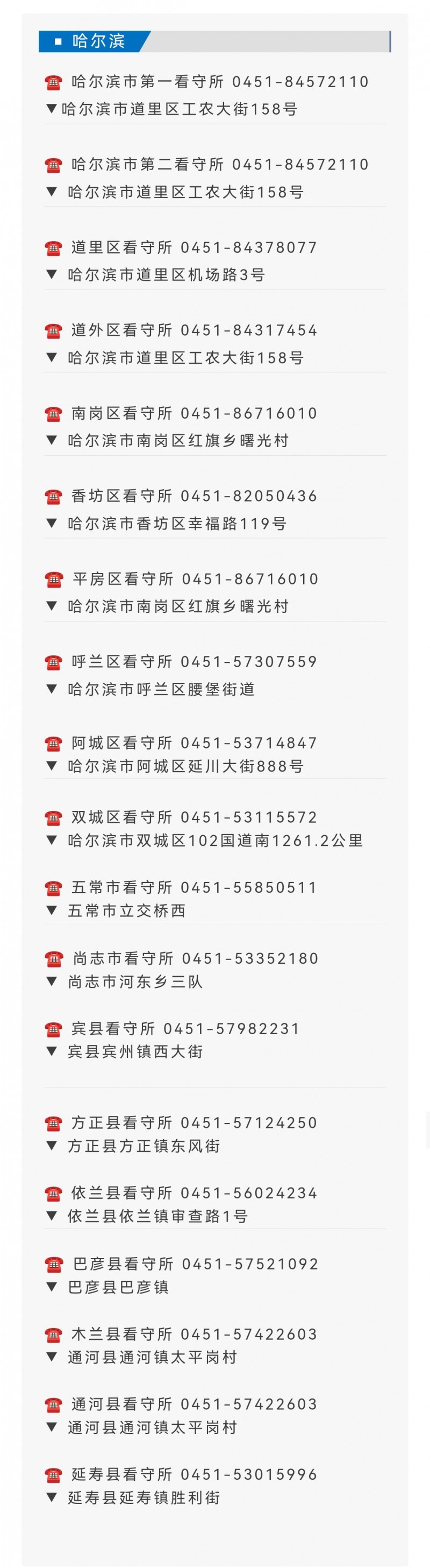 提示:关于哈尔滨市辖区各个看守所的单位地址和对外联系电话汇总表的信息作出免责提示,信息来源于当地主管部门公开之内容,整理转载此文是出于传递更多便民服务信息之目的。以上信息仅供参考,由于时间及其他方面的原因可能会发生变动,不准确之处请原谅!若有来源标注错误或者其它差错或侵犯了您的合法权益,请与本网站联系,我们将及时更正、删除。以上便民信息内容如有变更,以相关部门的更新内容为主。谢谢。