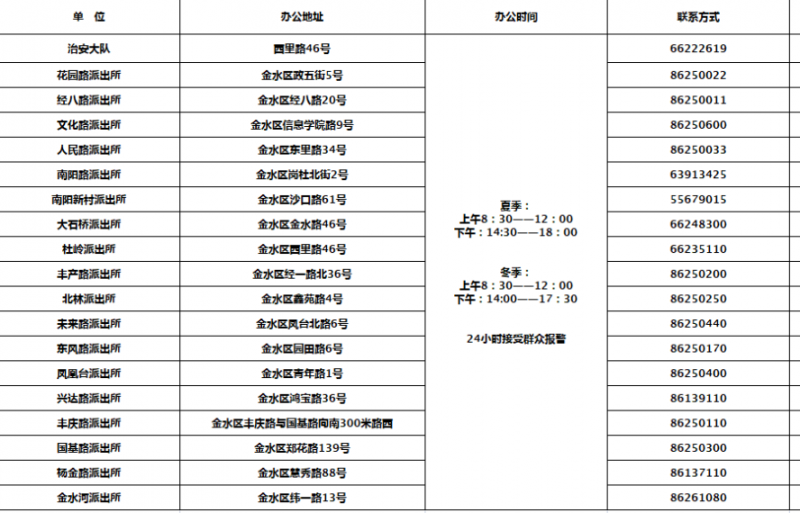 文化路派出所:金水区信息学院路9号,86250600 86250610