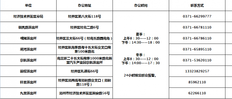郑州市经济技术开发区各派出所联系电话号码及地址信息汇总表: