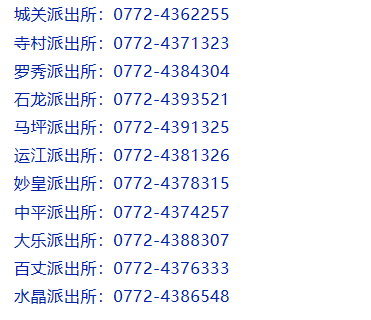 来宾市象州县辖区派出所联系电话号码汇总表:城关派出所 、 寺村派出所、罗秀派出所、石龙派出所、马坪派出所、运江派出所、妙皇派出所、中平派出所、大乐派出所、百丈派出所、水晶派出所