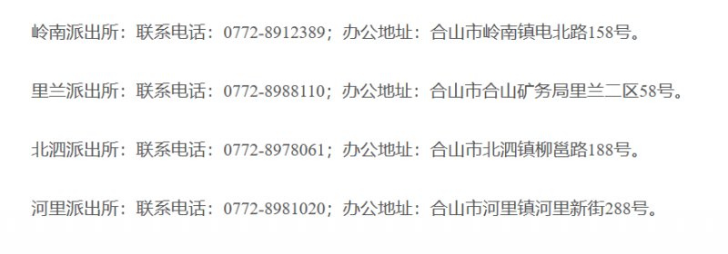 广西合山市各派出所联系电话和办公地址大全表:合山市下设四个派出机构:岭南派出所、里兰派出所、北泗派出所、河里派出所。