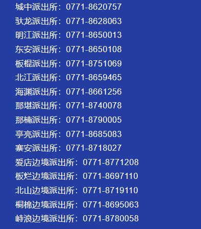 便民信息公开:崇左市宁明县辖区各派出所值班电话号码大全表。城中派出所、驮龙派出所、明江派出所、东安派出所、板棍派出所、北江派出所、海渊派出所、那堪派出所、那楠派出所、亭亮派出所、寨安派出所、爱店边境派出所、板烂边境派出所、北山边境派出所、桐棉边境派出所、峙浪边境派出所