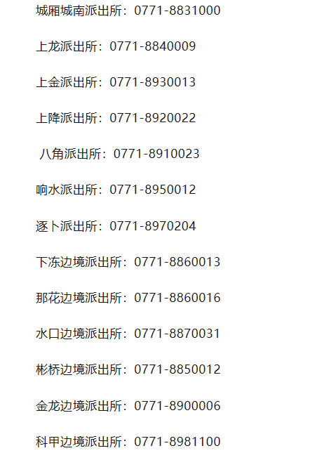 便民黄页:龙州县各派出所户籍窗口业务咨询电话号码汇总表。城厢城南派出所、上龙派出所、上金派出所、上降派出所、八角派出所、响水派出所、逐卜派出所、下冻边境派出所、那花边境派出所、水口边境派出所、彬桥边境派出所、金龙边境派出所、科甲边境派出所。