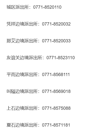 提示:关于广西凭祥市辖区派出所值班电话号码汇总表的信息作出免责提示,1,信息的源处为凭祥市政府主管部门公开之内容,在这里整理及转发的唯一目的是为社会提供更多的便民利民网络信息。互联网的存在,让我们多了一个方便快捷的信息渠道,也是公共服务信息发布的渠道。