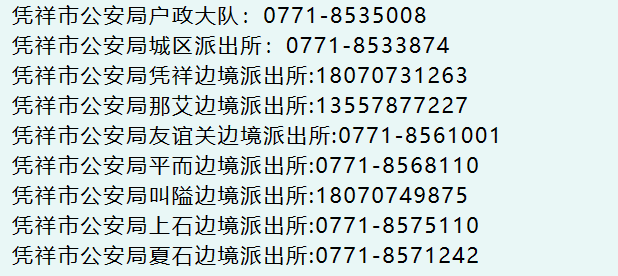 便民电话黄页:凭祥市各派出所户籍业务咨询电话汇总表。凭祥市城区派出所、凭祥市凭祥边境派出所、凭祥市那艾边境派出所、凭祥市友谊关边境派出所、凭祥市平而边境派出所、凭祥市叫隘边境派出所、凭祥市上石边境派出所、凭祥市夏石边境派出所。