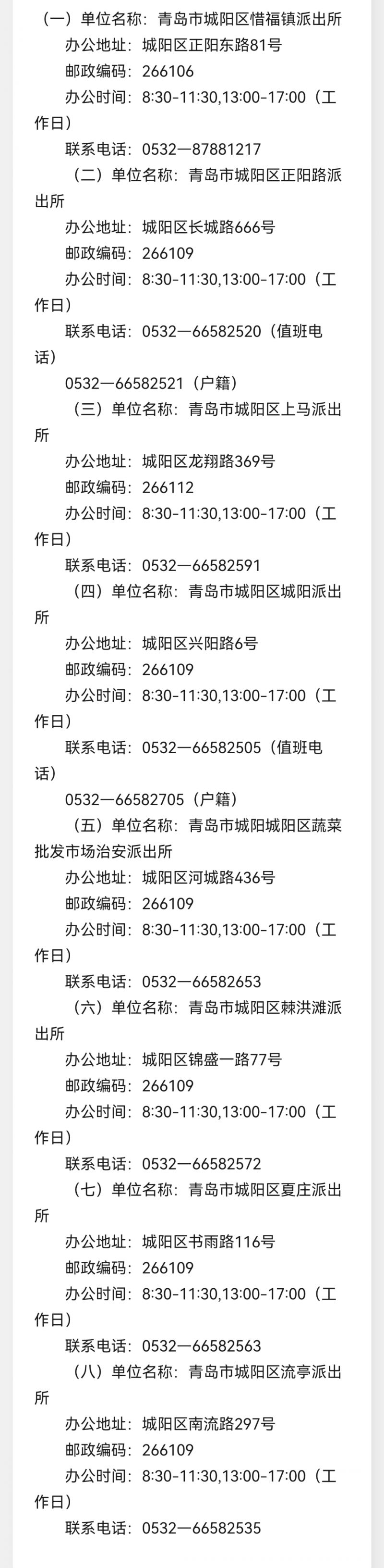 青岛市城阳区各派出所名称、联系电话和办公地址信息汇总表: