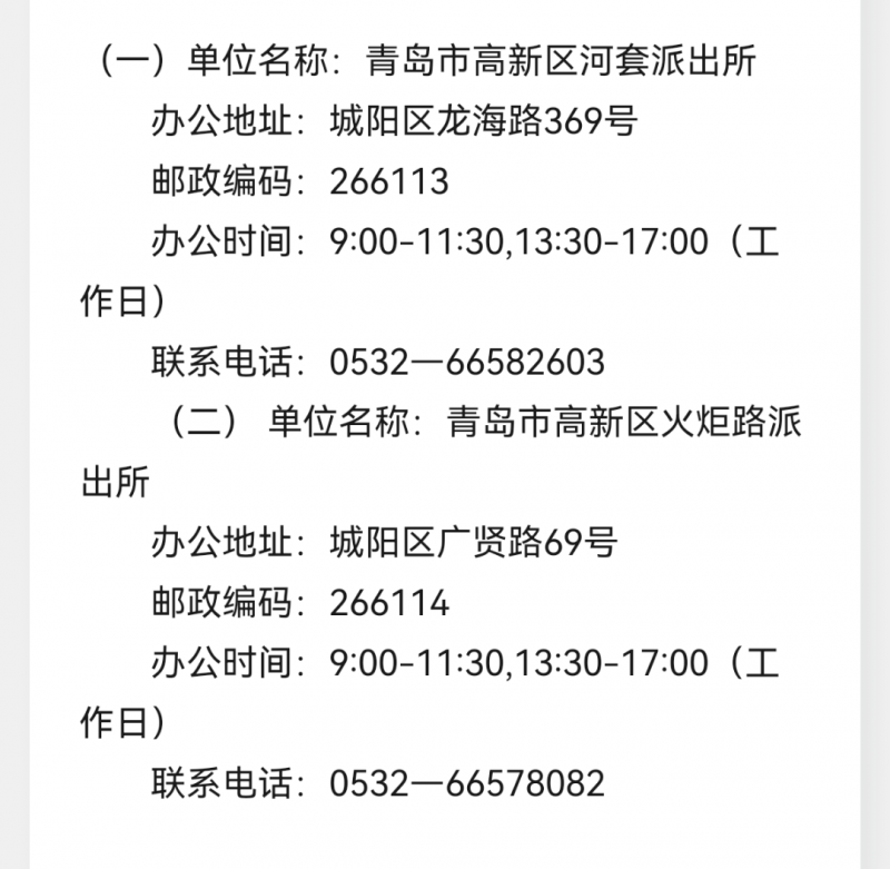 (二) 单位名称:青岛市公安局高新分局火炬路派出所
