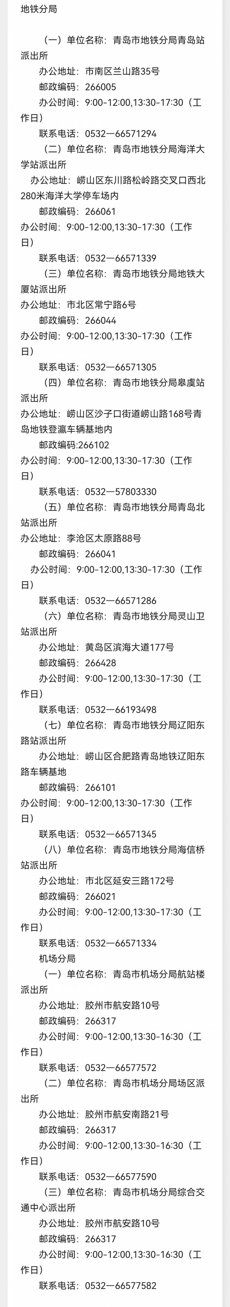 青岛市地铁分局、机场分局各派出所联系电话和办公地址信息汇总表: