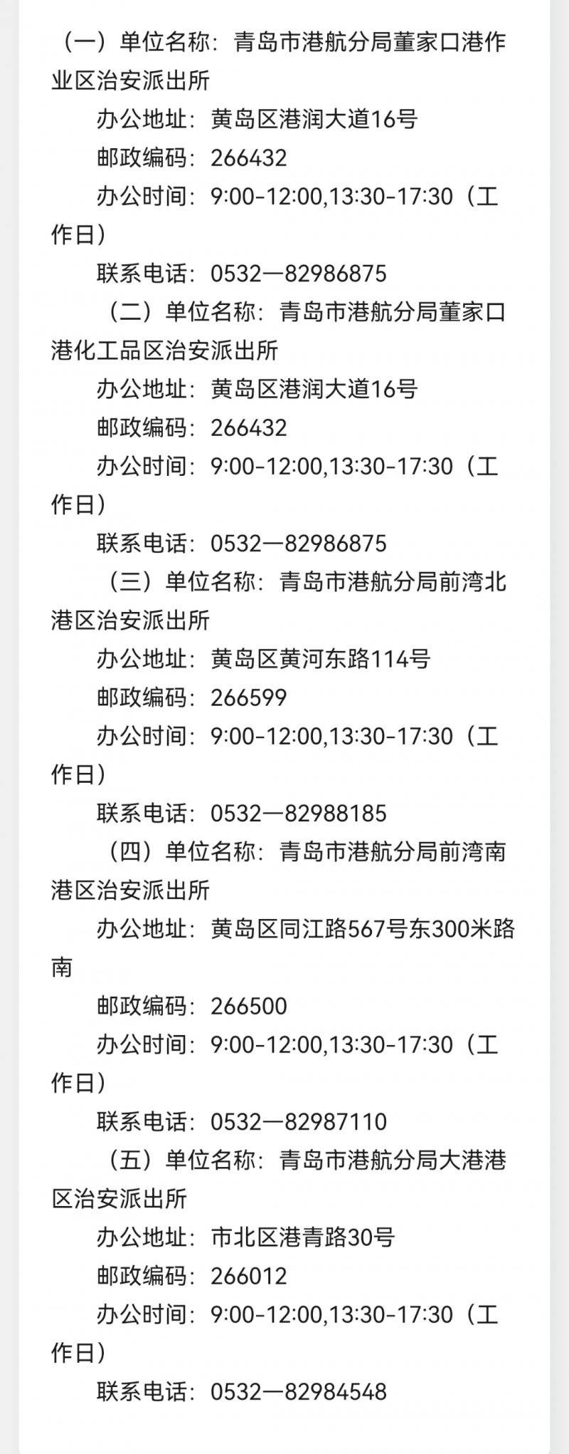 青岛市港航分局各派出所联系电话及办公地址大全表:
