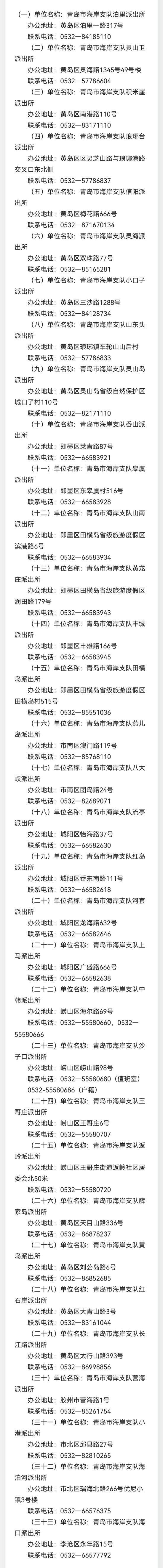 青岛市海岸支队各派出所联系电话及办公地址汇总表: