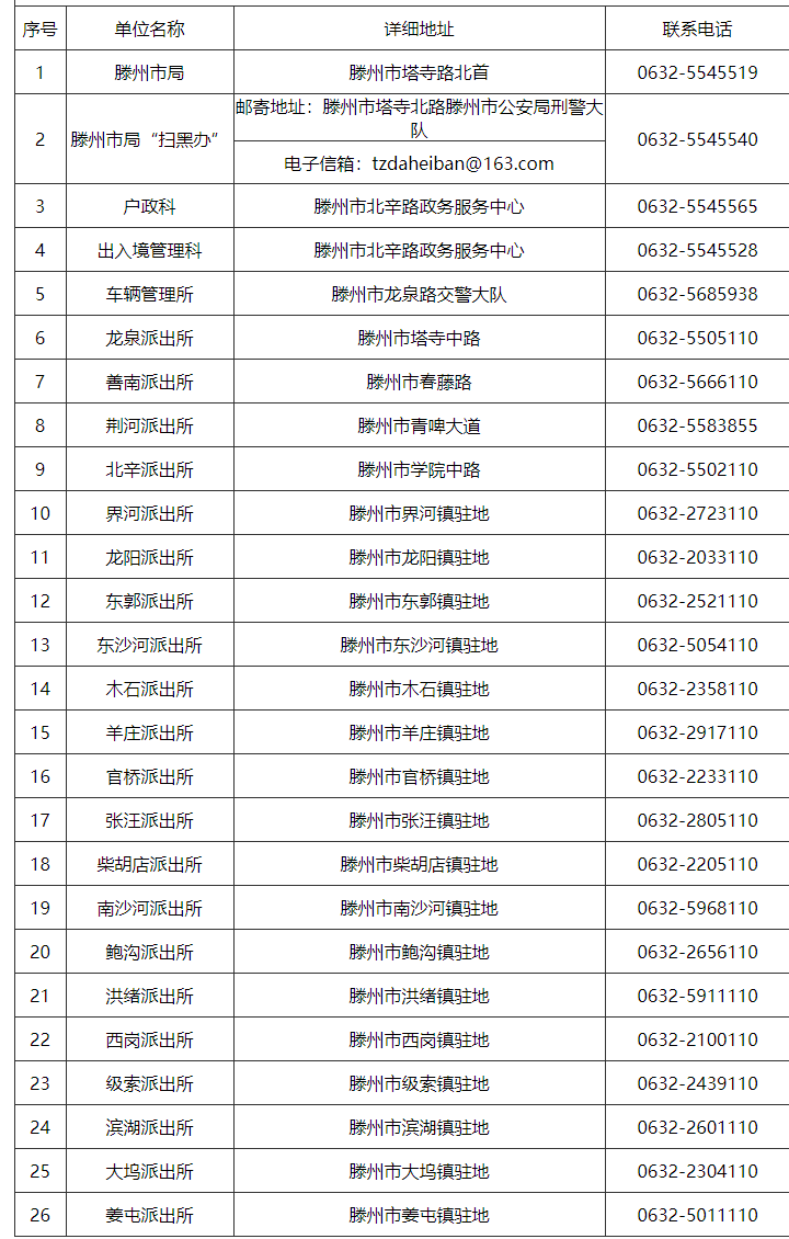 滕州市出入境管理科、户政科、车辆管理所、各派出所联系电话及地址大全表:户政科、出入境管理科、车辆管理所、龙泉派出所、善南派出所、荆河派出所、北辛派出所、界河派出所、龙阳派出所、东郭派出所、东沙河派出所、木石派出所、羊庄派出所、官桥派出所、张汪派出所、柴胡店派出所、南沙河派出所、鲍沟派出所、洪绪派出所、西岗派出所、级索派出所、滨湖派出所、大坞派出所、姜屯派出所。