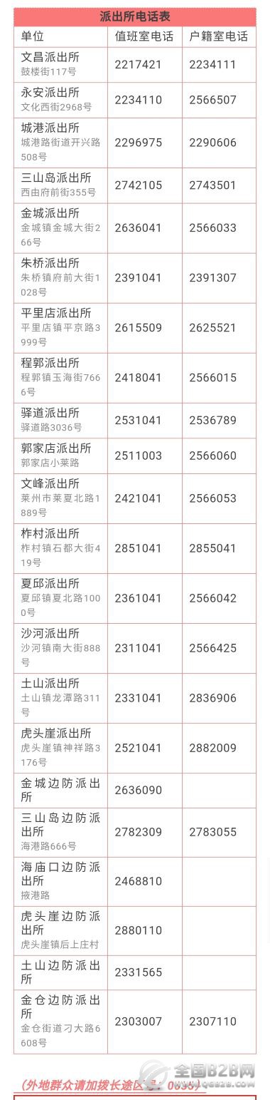 说明:关于莱州市各派出所值班室电话和户籍室电话大全表的信息作出免责说明,本信息来源于网络收集整理,转载转发的目的在于传递更多便民利民之信息,并不代表本信息赞同其观点和对其真实性负责,也不构成任何其他建议。
