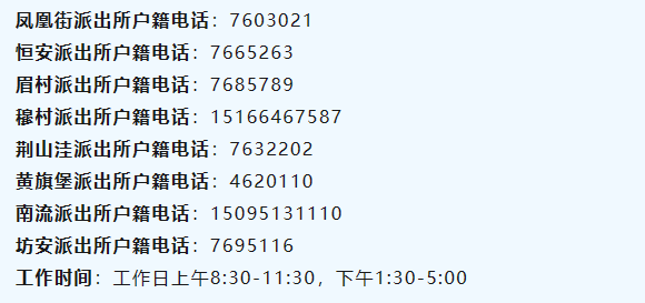 潍坊市坊子区各派出所户籍电话号码汇总表:恒安派出所、眉村派出所、穆村派出所、荆山洼派出所、南流派出所、黄旗堡派出所、坊安派出所、坊子区政务服务中心(凤凰街)。