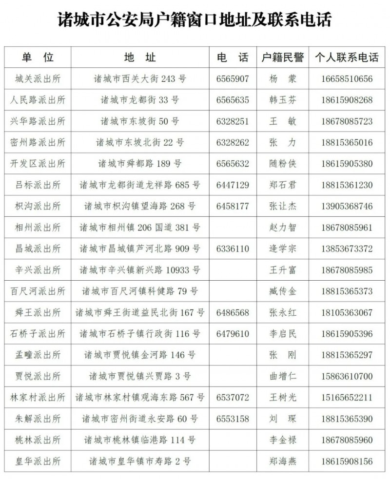 说明:关于诸城市辖区19处派出所户籍窗口地址及联系电话大全表的信息作出免责说明,1,信息的源处为当地政府主管部门公开之内容,在这里整理及转发的唯一目的是为社会提供更多的便民利民网络信息。互联网的存在,让我们多了一个方便快捷的信息渠道,也是公共服务信息发布的渠道。