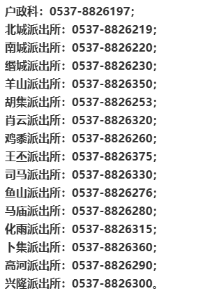 提示:关于济宁金乡县各派出所户籍业务咨询联系电话汇总表的信息作出免责提示,1,信息的源处为当地政府主管部门公开之内容,在这里整理及转发的唯一目的是为社会提供更多的便民利民网络信息。互联网的存在,让我们多了一个方便快捷的信息渠道,也是公共服务信息发布的渠道。