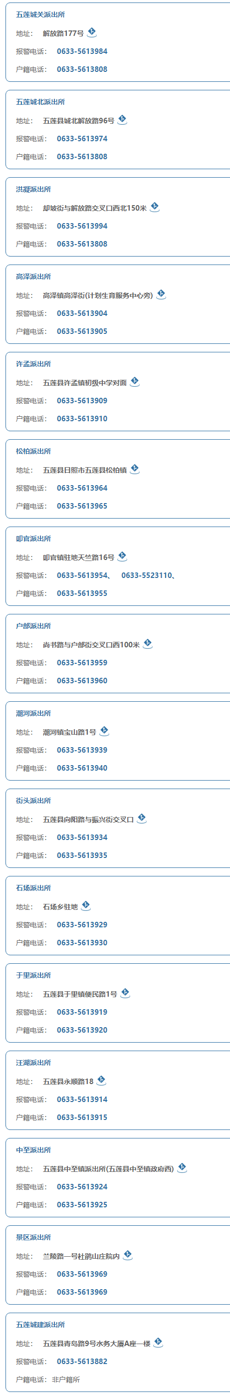 日照市五莲县辖区各派出所报警值班电话、户籍窗口电话和办公地址大全: