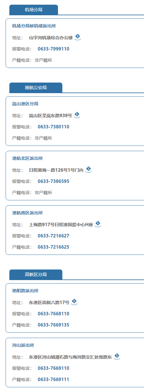 声明:关于日照市(区县)辖区各派出所报警值班电话、户籍窗口电话和办公地址大全的信息作出免责声明,1,信息的源处为日照市政府主管部门网站公开之内容,在这里整理及转发的唯一目的是为社会提供更多的便民利民网络信息。互联网的存在,让我们多了一个方便快捷的信息渠道,也是公共服务信息发布的渠道。