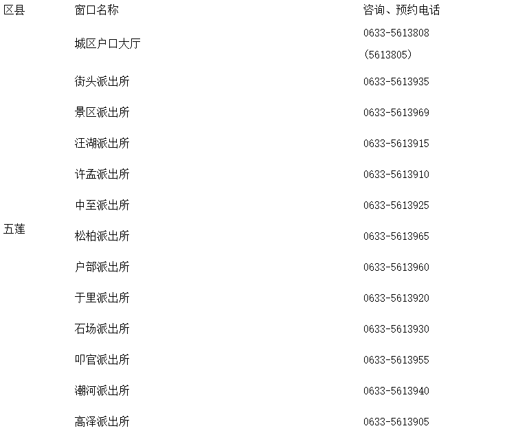 便民信息黄页:五莲县各派出所户籍窗口咨询预约电话号码汇总表。