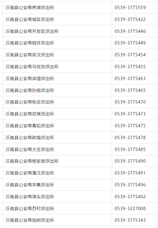 山东临沂沂南县各派出所户政窗口业务咨询预约电话号码大全表:沂南县界湖派出所 、沂南县城区派出所 、沂南县开发区派出所、 沂南县铜井派出所 、沂南县依汶派出所 、沂南县马牧池派出所、 沂南县岸堤派出所 、沂南县孙祖派出所 、 沂南县张庄派出所 、沂南县双堠派出所、 沂南县青驼派出所 、 沂南县砖埠派出所 、沂南县大庄派出所、 沂南县杨家坡派出所 、沂南县蒲汪派出所 、沂南县辛集派出所 、沂南县湖头派出所、 沂南县苏村派出所 、沂南县独树派出所