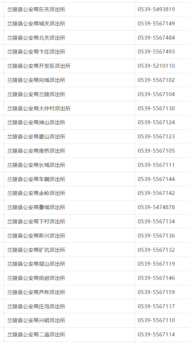 临沂兰陵县辖区派出所户政户籍窗口咨询预约电话号码大全表:兰陵县东关派出所 、兰陵县城关派出所 、兰陵县北关派出所 、兰陵县卞庄派出所 、兰陵县开发区派出所 、兰陵县向城派出所 、 兰陵县兰陵派出所 、兰陵县大仲村派出所 、兰陵县神山派出所 、兰陵县磨山派出所 、兰陵县南桥派出所 、兰陵县长城派出所、 兰陵县车辋派出所 、兰陵县金岭派出所 、兰陵县鲁城派出所 、兰陵县下村派出所 、兰陵县新兴派出所 、兰陵县矿坑派出所 、兰陵县层山派出所 、兰陵县尙岩派出所 、兰陵县芦柞派出所 、兰陵县庄坞派出所 、兰陵县兴明派出所、兰陵县二庙派出所