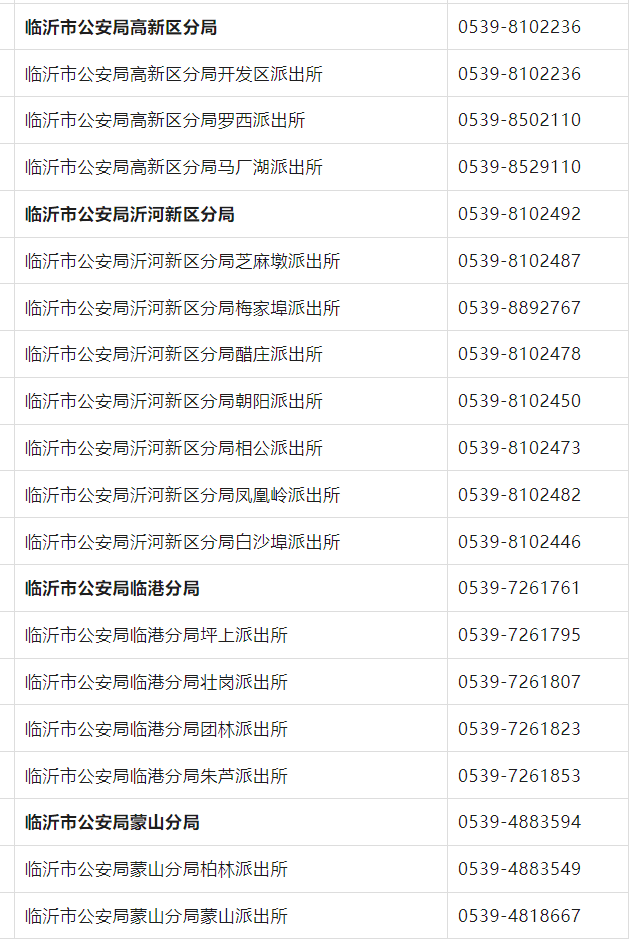 山东临沂市高新区、沂河新区、临港区、蒙山分局辖区各派出所户政户籍窗口业务咨询预约电话大全表: