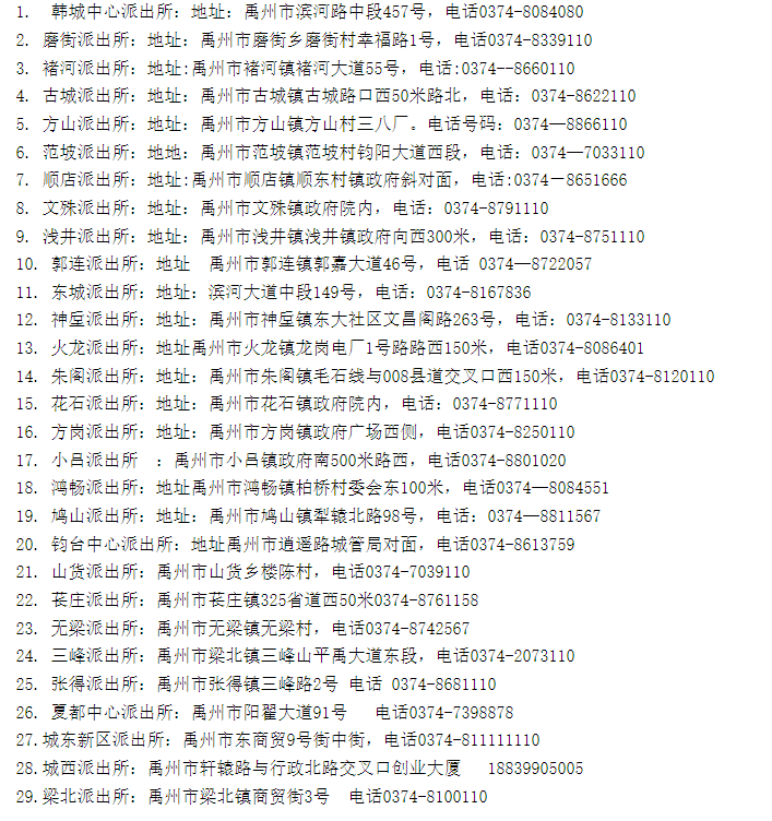 8. 文殊派出所:地址:禹州市文殊镇政府院内,