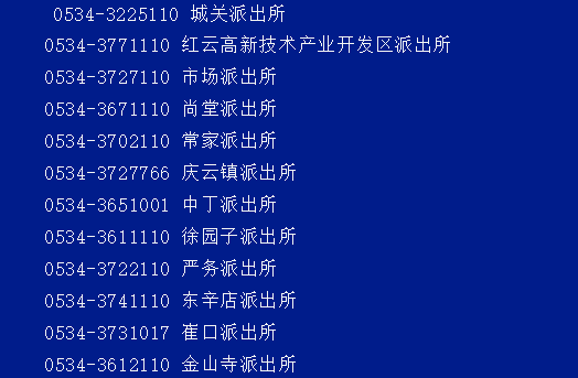 便民信息黄页:德州庆云县各派出所值班电话号码汇总表。城关派出所、红云高新技术产业开发区派出所、市场派出所 、尚堂派出所、常家派出所、庆云镇派出所、中丁派出所、徐园子派出所、严务派出所、东辛店派出所、崔口派出所、金山寺派出所