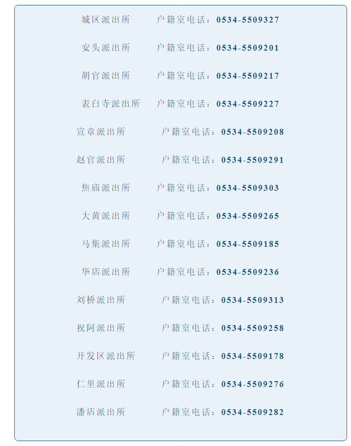 山东齐河县各派出所户籍室咨询电话号码大全表:城区派出所户籍室电话安头派出所户籍室电话胡官派出所户籍室电话表白寺派出所户籍室电话宣章派出所户籍室电话赵官派出所户籍室电话焦庙派出所户籍室电话大黄派出所户籍室电话马集派出所户籍室电话华店派出所户籍室电话刘桥派出所户籍室电话祝阿派出所户籍室电话开发区派出所户籍室电话仁里派出所户籍室电话潘店派出所户籍室电话