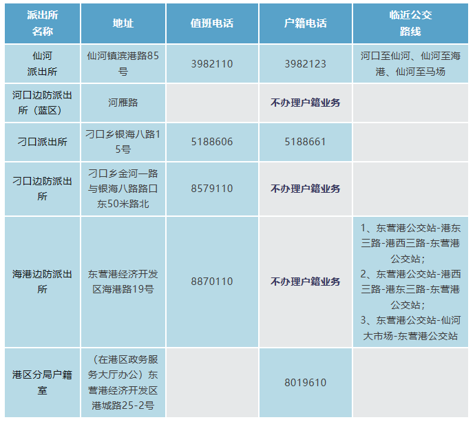 东营市东营港区辖区派出所值班电话、户籍电话及办公地址信息一览表: