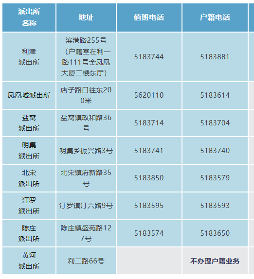 东营市利津县辖区派出所值班电话、户籍电话及办公地址信息一览表: