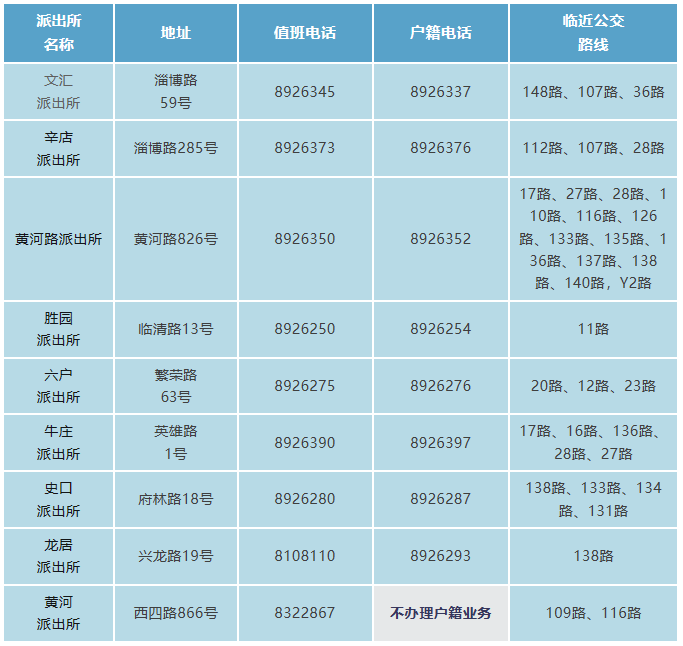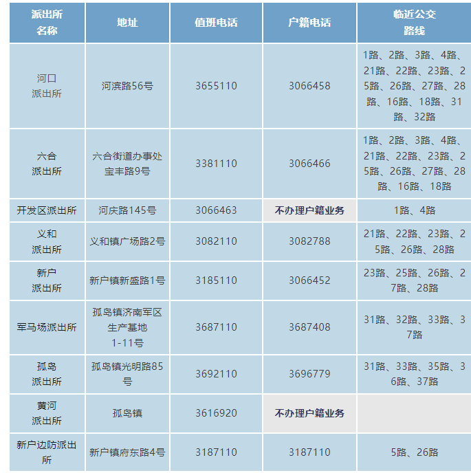 东营市经济技术开发区辖区派出所值班电话、户籍电话及办公地址信息一览表: