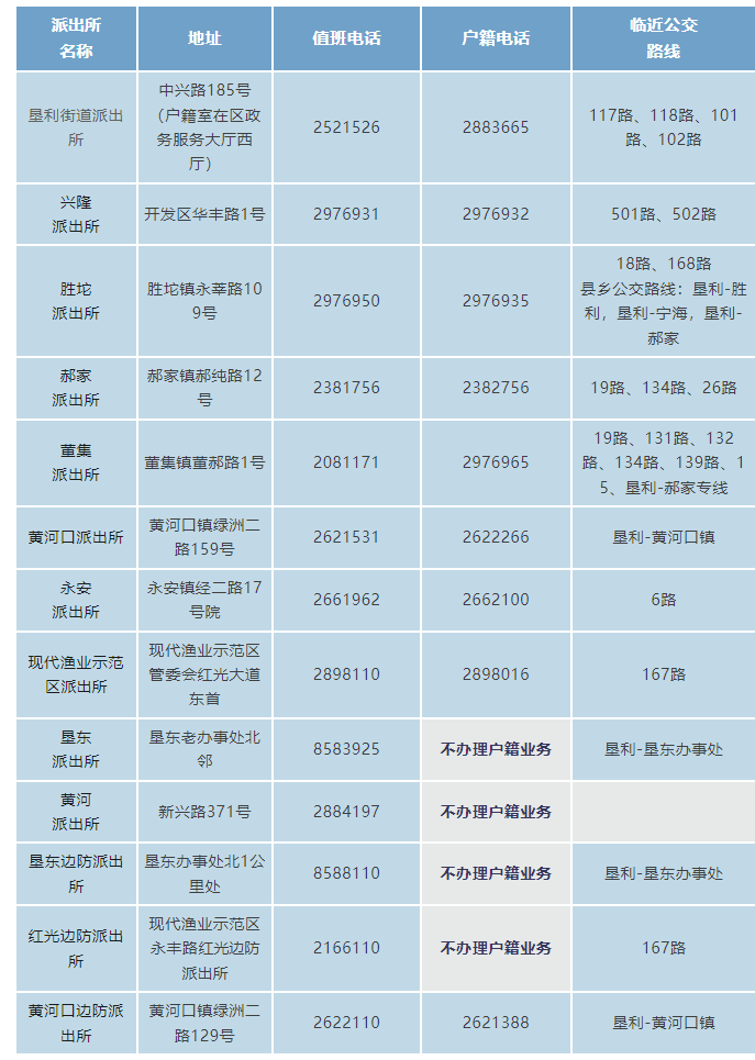 东营市垦利区辖区派出所值班电话、户籍电话及办公地址信息一览表: