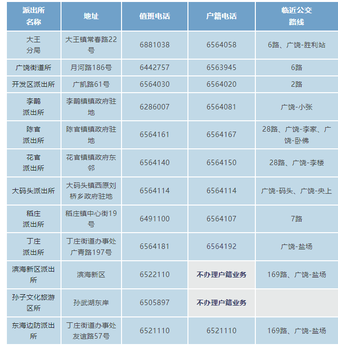 东营市广饶县辖区派出所值班电话、户籍电话及办公地址信息一览表: