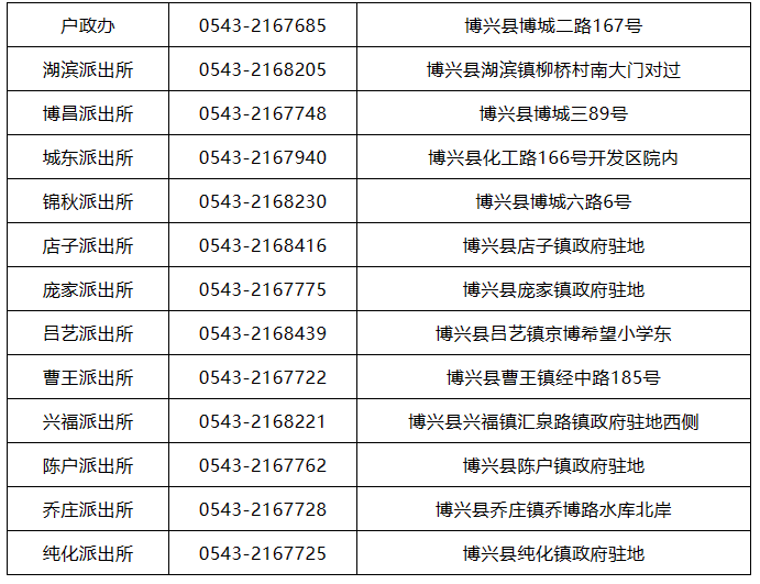 说明:关于滨州市博兴县各派出所户籍窗口咨询联系电话号码大全表的信息作出免责说明,本信息仅为提供便民服务目的而发布,相关信息来源于博兴县主管机构之公开内容。本信息仅作参考,信息的准确性和完整性在此不作任何保证,也不保证所包含的信息和建议不会发生任何变更,我们仅对公开资料中的内容做原文提取或者整理转载。虽然已力求信息的客观完整,但随着时间与其它情况发生,难免信息出现差错或者变更。如果出现差错或者侵犯了您的权利,请通知本网站客服,我们将及时更正或者删除。谢谢。