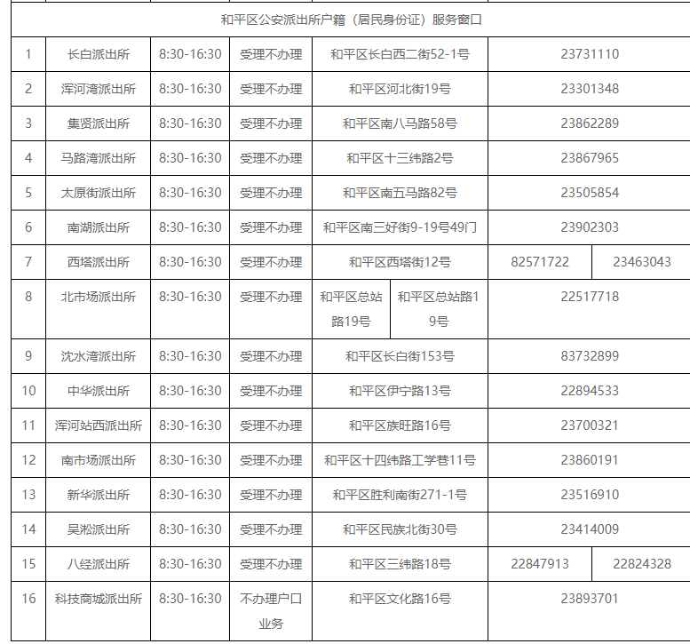 声明:关于沈阳市和平区各派出所户籍(居民身份证)服务窗口联系电话及地址的信息作出免责声明,1,信息的源处为沈阳市和平区政府主管部门网站公开之内容,在这里整理及转发的唯一目的是为社会提供更多的便民利民网络信息。互联网的存在,让我们多了一个方便快捷的信息渠道,也是公共服务信息发布的渠道。