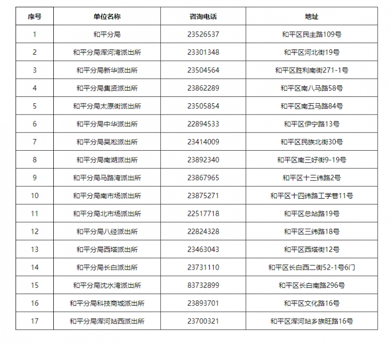 沈阳市和平区辖区派出所办公咨询电话和办公地址信息明细表:沈阳市和平区辖区各有哪些派出所?派出所单位地址在哪?派出所值班服务电话是多少?在这里将为你带来沈阳市和平区辖区派出所的相关便民信息,希望能帮到你。