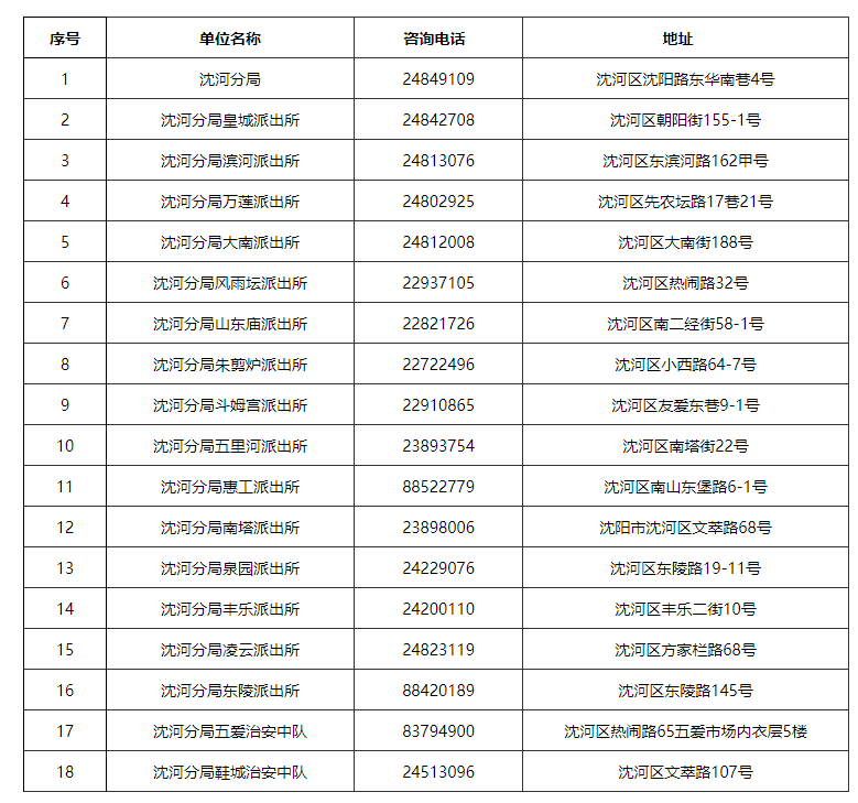 声明:关于沈阳市沈河区辖区派出所办公联系电话及单位地址信息明细表的信息作出免责声明,1,信息的源处为沈阳市沈河区政府主管部门网站公开之内容,在这里整理及转发的唯一目的是为社会提供更多的便民利民网络信息。互联网的存在,让我们多了一个方便快捷的信息渠道,也是公共服务信息发布的渠道。