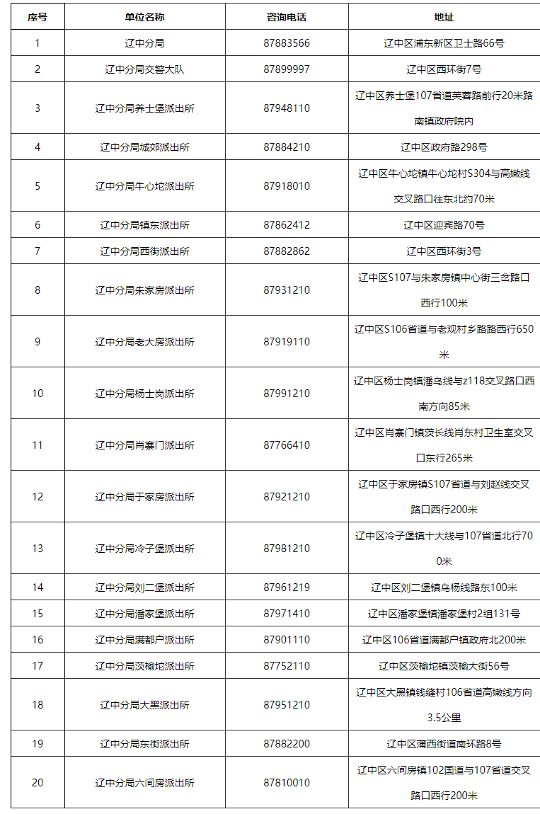 声明:关于沈阳市辽中区辖区派出所名称、联系电话号码及单位地址信息明细表的信息作出免责声明,1,信息的源处为沈阳市辽中区政府主管部门网站公开之内容,在这里整理及转发的唯一目的是为社会提供更多的便民利民网络信息。互联网的存在,让我们多了一个方便快捷的信息渠道,也是公共服务信息发布的渠道。