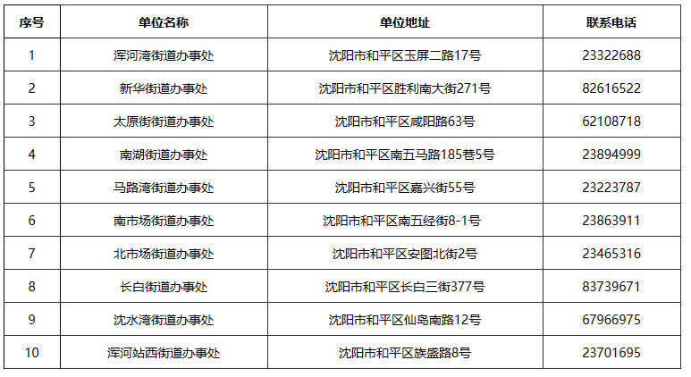 沈阳市和平区辖区各街道办事处对外联系电话和地址汇总表: