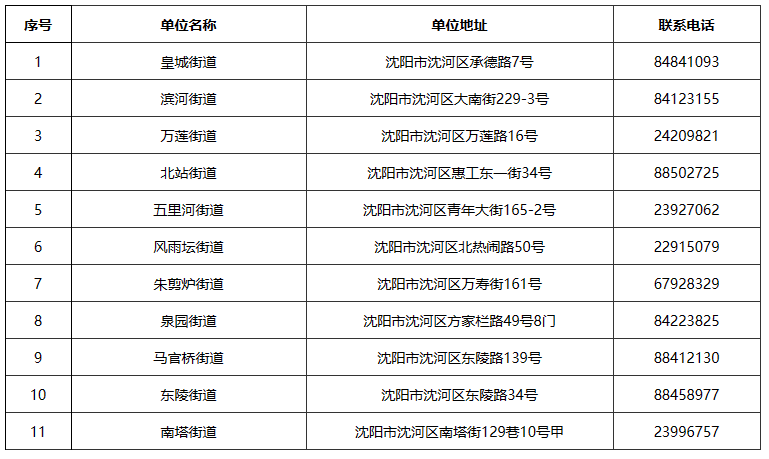 沈阳市沈河区辖区各街道办事处对外联系电话和单位地址大全表:沈阳市沈河区辖区有多少个街道办事处,每个街道办事处地址在哪里,每个街道办事处的对外联系电话是多少?