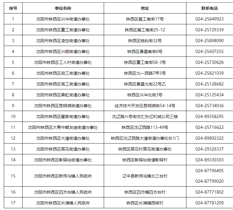 沈阳市铁西区辖区街道办事处、镇政府联系电话及单位地址一览表:
