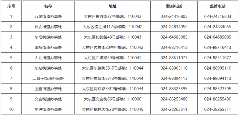 沈阳市大东区辖区各街道办事处联系电话及单位地址大全表: