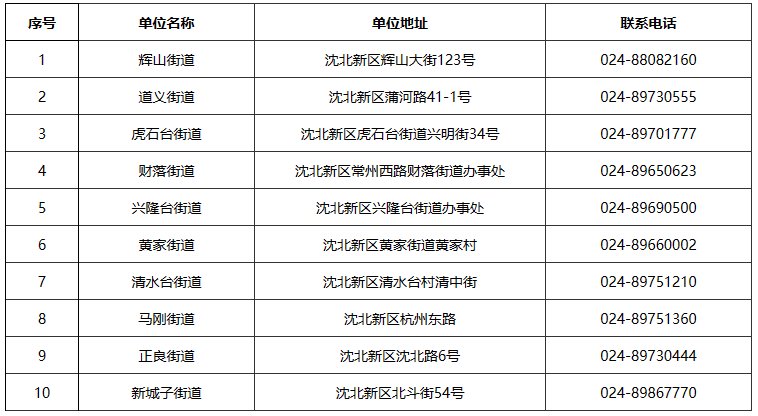 沈阳市沈北新区各个街道办事处地址和电话一览表: