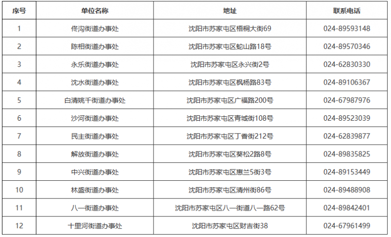 沈阳市苏家屯区各街道办事处联系电话及地址大全表: